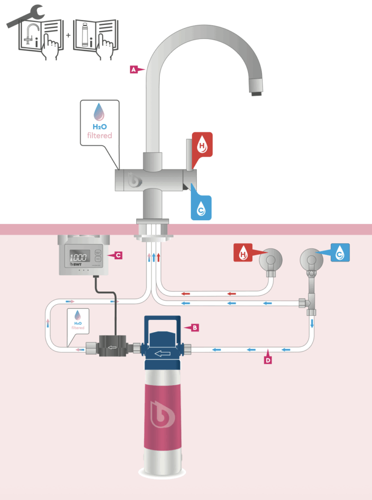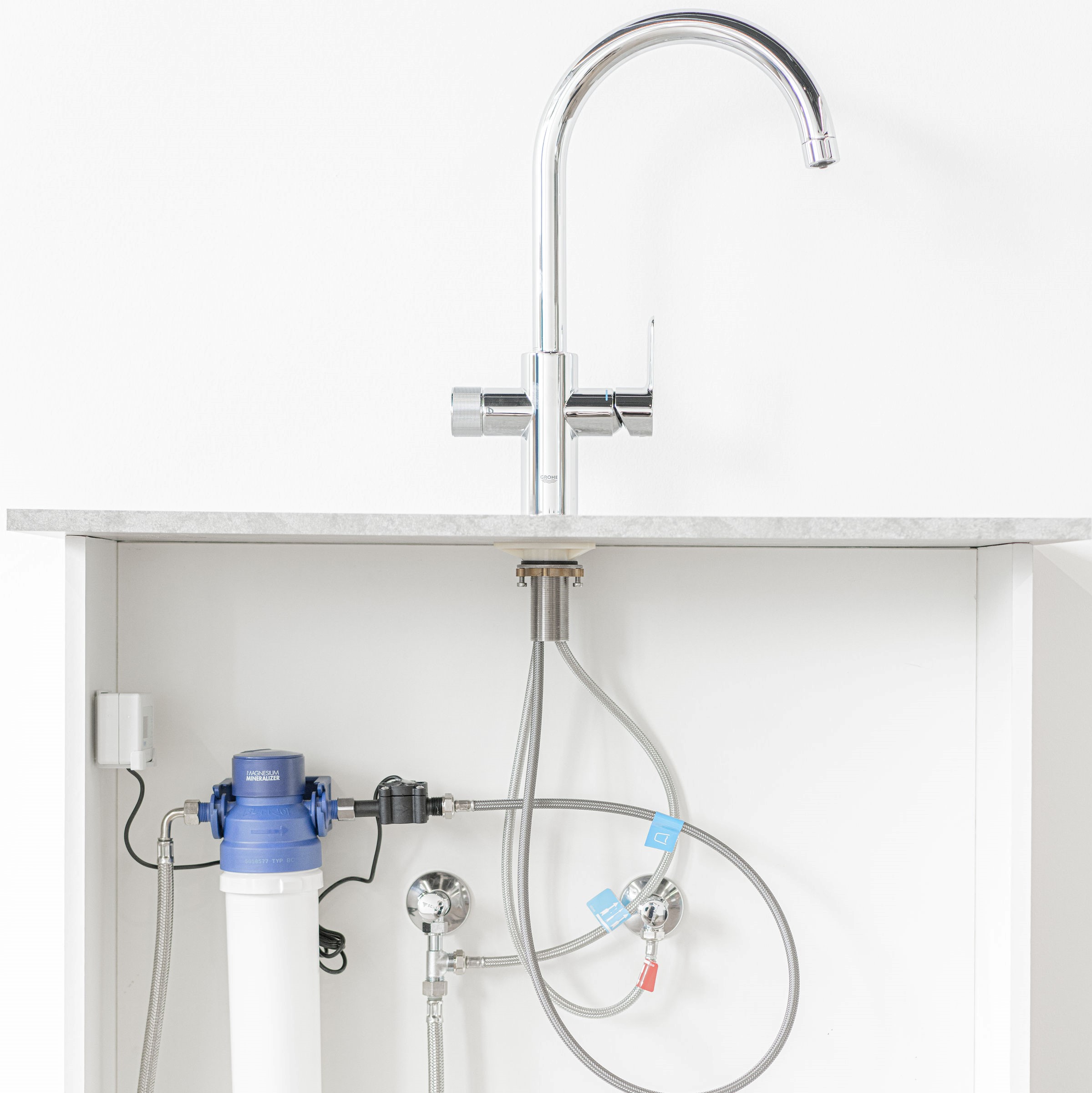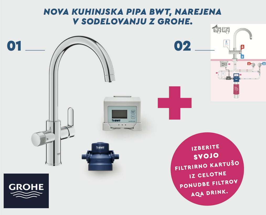 Filtrirna kartuša se namesti neposredno pod kuhinjski pult in se poveže z vodovodnim omrežjem ter armaturo. Na armaturi GROHE se nahajata dva ročaja – eden za filtrirano vodo in eden za nefiltrirano vodo. Digitalni števec nadzoruje kapaciteto filtra in sporoči, kdaj je potrebna menjava. Ko je čas za zamenjavo filtra, se oglasi zvočni signal.
